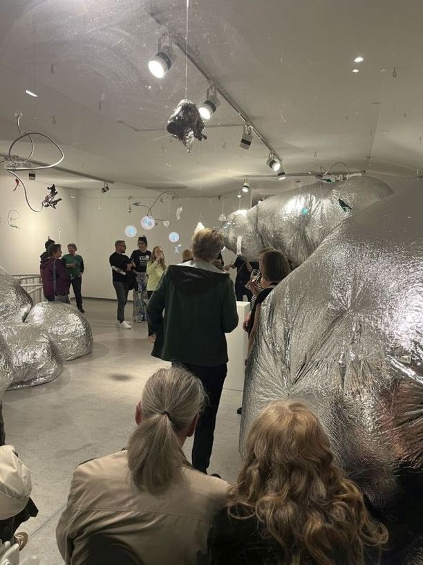 Besucher:innen finden sich zwischen Inflatables und hängenden Glasobjekten wieder. Die Objekte stehen durch ihre Materialität gleichzeitig im Kontrast und im Einklang. Einerseits durch Gewicht und Volumen, andererseits durch ihre Oberfläche und Beweglichkeit. Alle Objekte agieren mit Licht, reflektieren und spiegeln sich ineinander und schaffen so ein Zusammenspiel. Der Ursprung und die grundlegende Form sind Sphären. Das Material: Luft, Folie, Glas und Licht. Das Produkt: eine Landschaft, die erkundet werden kann, nicht nur im Objekt, sondern auch im Tun.