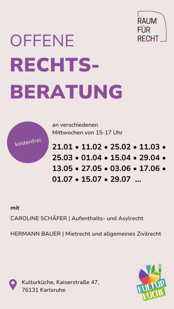 An verschiedenen Mittwochen bietet Caroline Schäfer von raum-fuer-recht.de und Hermann Bauer von 15-17 Uhr kostenfreie Rechtsberatung in der Kulturküche an.